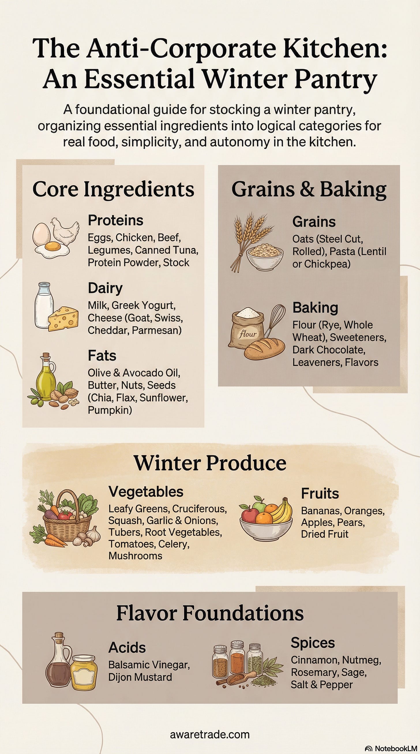 A small, well-chosen winter pantry can produce hundreds of meals: Soups, stews, baked dishes, breakfasts, breads, snacks, and desserts—without relying on corporate shortcuts.