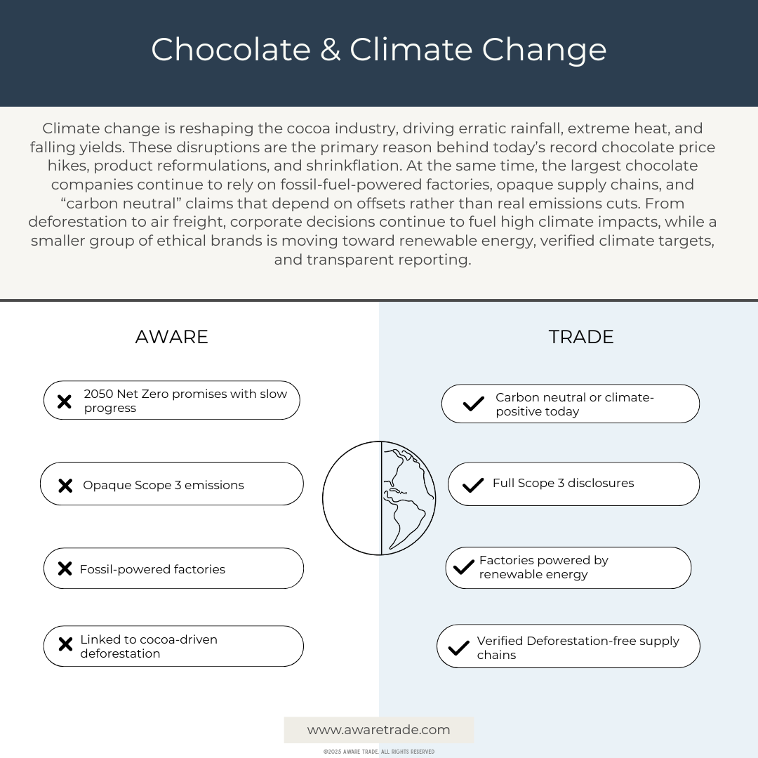 Climate change is pushing cocoa to the brink. Farmers are watching their crops fail under extreme heat, unpredictable rains, and spreading disease, which is the real reason chocolate prices are exploding and bars are shrinking. Yet the biggest chocolate corporations continue dragging their feet, clinging to fossil-powered factories and distant Net Zero by 2050 promises while emissions keep rising. Their supply chains remain opaque, their climate claims are often unverified, and their progress is painfully slow. Meanwhile, smaller ethical brands are already cutting emissions, shifting to renewable energy, and protecting forests. The climate crisis is here, and Big Chocolate is still acting like it can wait.