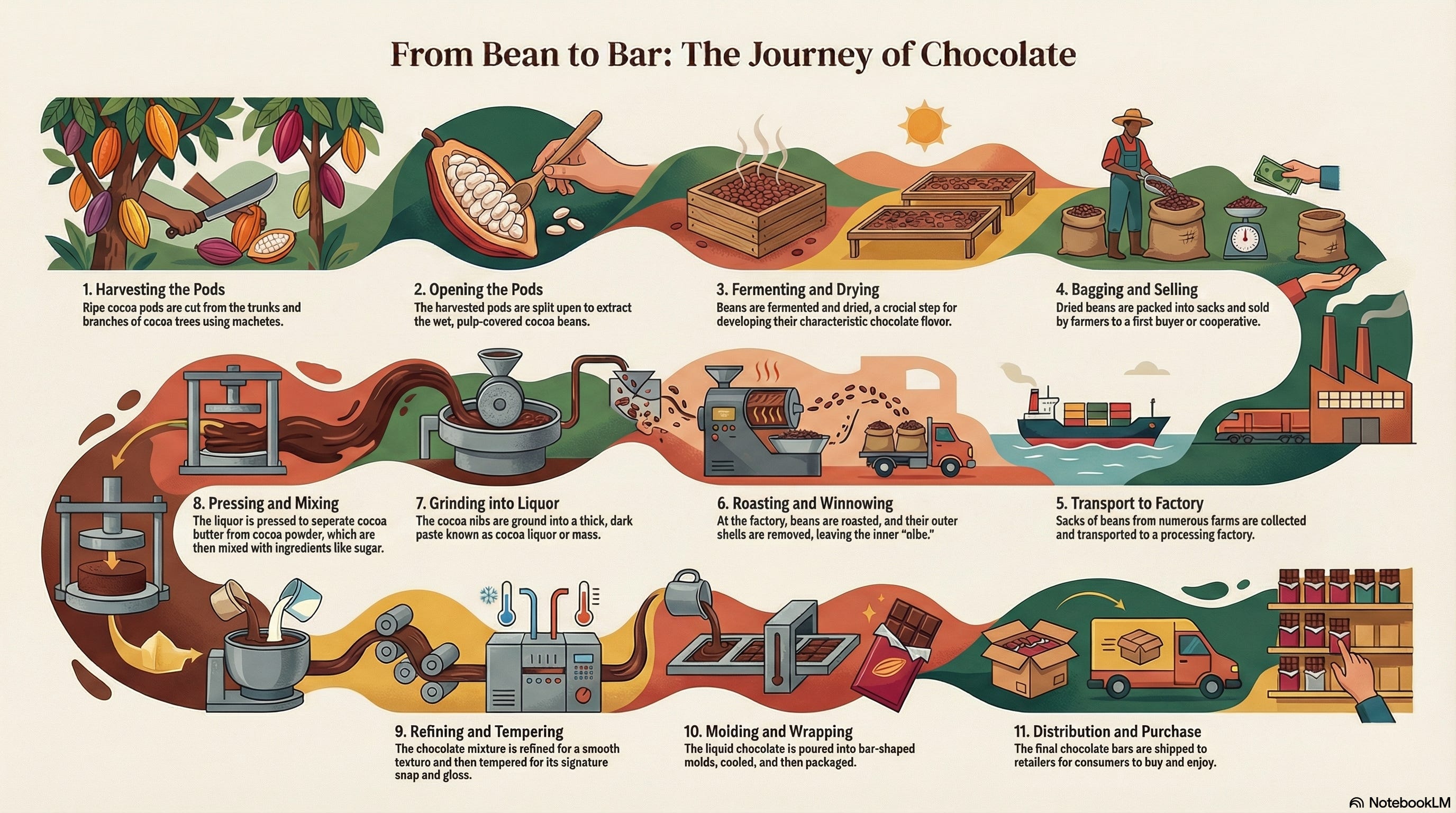 Chocolate begins not as a bar or bonbon, but as a fruit. Every stage of its transformation—from tropical pod to finished chocolate—shapes its flavor, texture, and health potential.